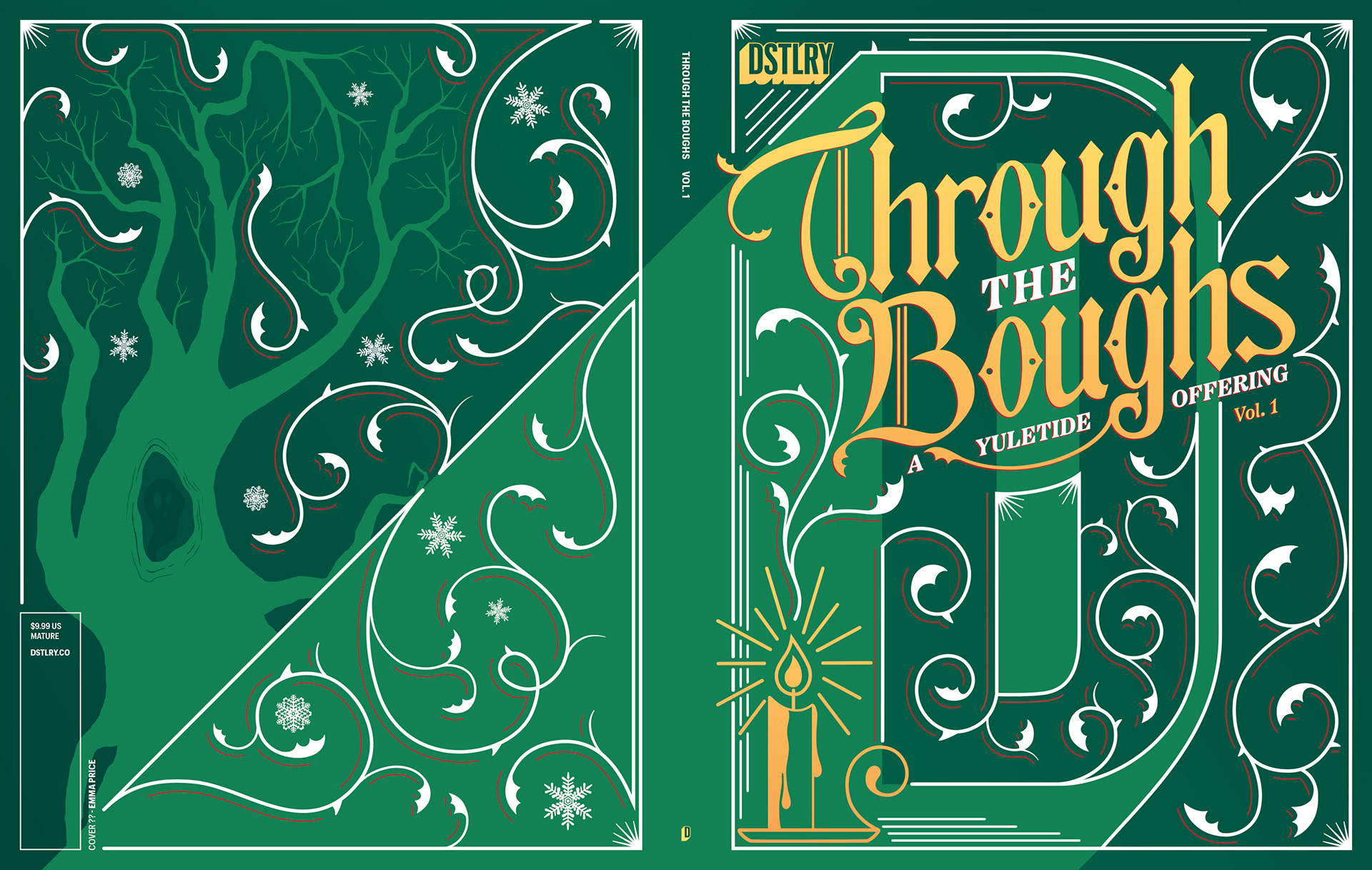 For the logo I looked at a number of different styles, taking inspiration from the covers of Victorian illuminated, leather-bound books. Amazingly, the team really liked two of the options, so they asked me to finalise one for the anthology, to be used across the main cover and most of the variants, but they also asked me to adapt a second route into a complete variant cover, which I developed into a whole cover wrap.